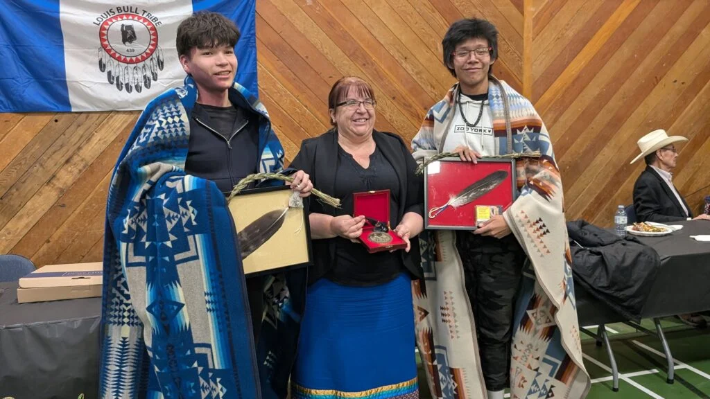 Elias Mykat (L) and Kenyon Bull (R) displaying the special blankets and eagle feathers they received from their nations while MANS principal Kim Harrington beams above the Treaty 6 medallion bestowed in the presence of honoured guests from Ermineskin Cree Nation and Louis Bull Tribe.